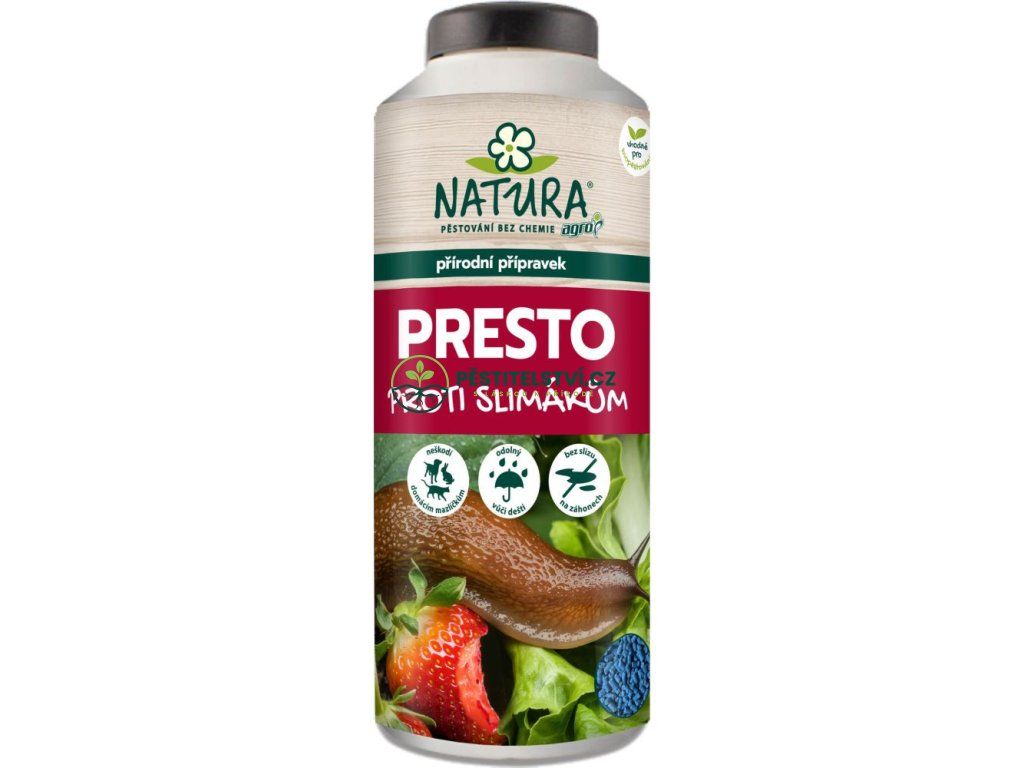 NATURA Presto proti všem druhům slimáků a plzáků na venkovních záhonech, ve skleníku i pařeništi. Je vysoce účinný – unikátní formulace, k usmrcení škůdců stačí menší porce návnady než u konkurenčních produktů (účinná látka ovlivní metabolismus škůdců, což vede k rychlejšímu pocitu sytosti, snížení žravosti, přestává se tvořit hlen a škůdce leze do úkrytu).