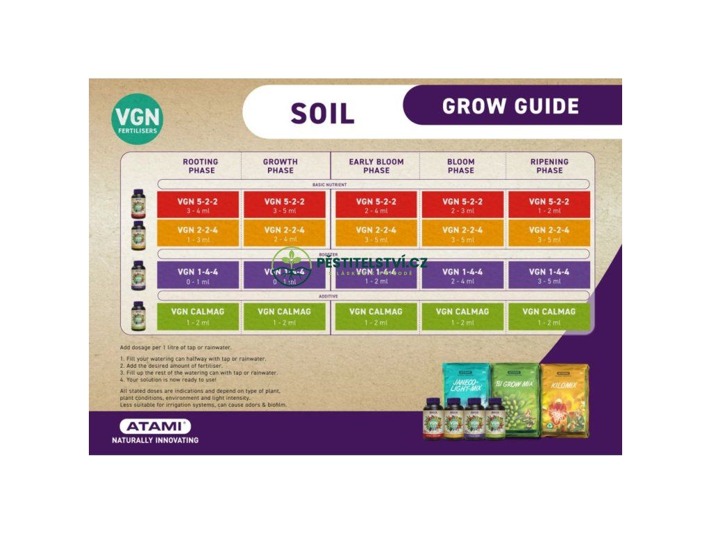 Květové hnojivo pro vynikající květy. Atami VGN 1-4-4 je tekuté hnojivo pro kvetoucí rostliny, které se získává zpracováním a smícháním různých rostlinných odpadů. VGN 1-4-4 je dokonalým doplňkem ostatních základních živin řady VGN. Dodá rostlinám dodatečný fosfor a draslík, které potřebují ve fázi kvetení a dozrávání.