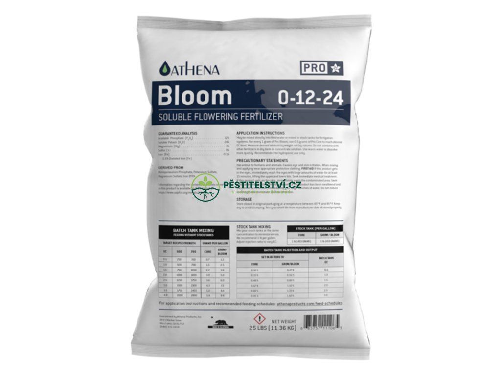 Kvetoucí rostliny potřebují větší množství fosforu (P) a draslíku (K), aby zvětšily objem květů a podpořily vysokou metabolickou aktivitu. Athena Pro Bloom přispívá vyváženým množstvím makro- a mikroprvků včetně síry (S), která se používá pro zvýšení síly a chuti.