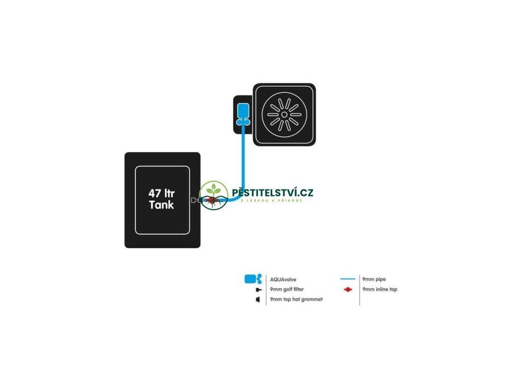 Nádrž, kohout, víko a 9mm průchodka pro horní část a 9mm in-line filtr nejsou součástí produktu, je třeba je dokoupit zvlášt.