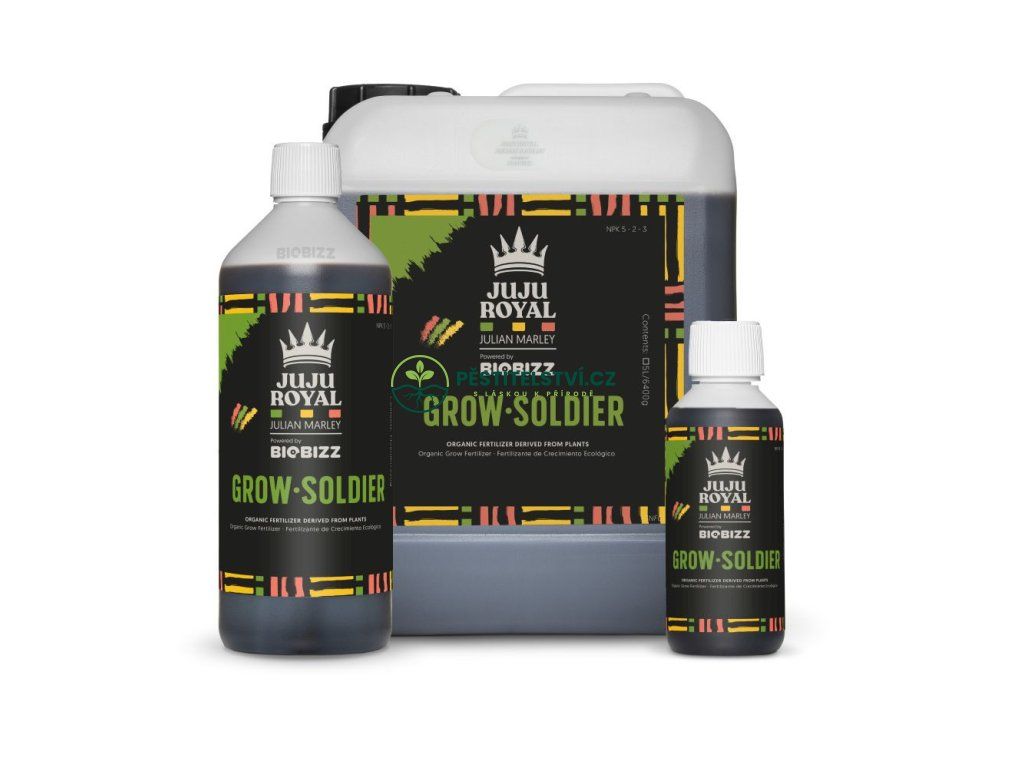 Organické růstové hnojivo Grow Soldier je vhodný zdroj NPK živin pro jakékoliv substrátové směsi, pěstební média a všechny metody pěstování. Biobizz Juju Royal Grow Soldier se používá od druhého týdne téměř po celý pěstební cyklus. Stimuluje růst i mikrobiální život.Používá se v poměru 1-4 ml na litr vody.