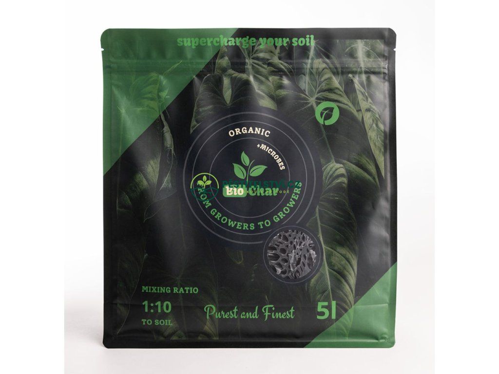 Vyrobeno z břízy a smrku, testované a zkoumané biouhlí určené pro kultivační média. Díky aktivitě biocharu se na jeho povrch v poměru k jeho velikosti váže velké množství molekul živin. Když se pomalu uvolňují pro rostliny, vyrovnávají hospodaření s živinami v půdě. Biouhel je přirozenou součástí ekosystému a spolu s přidanými mikroby poskytuje rostlinám příznivé podmínky pro rozkvět, růst a produkci plodin. Snižuje kyselost půdy díky zásaditosti (pH 10). Frakce 0-10 mm.