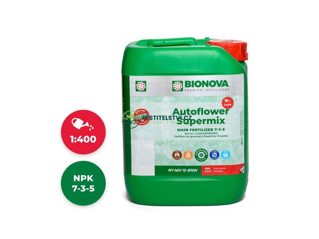 Jednosložková bio-minerální výživa pro pěstování samonakvétacích rostlin. Základní hnojivo pro celý pěstební cyklus BioNova AutoFlower Supermix obsahuje všechny důležité živiny a hodí se také pro hydroponické pěstování. Organické přísady v BioNova AutoFlower Supermix stimulují vlastní produkci hormonů, podporují imunitní systém a nižší míru onemocnění, posilují kořenový systém, přispívají k čistění závlahových systémů, podporují prospěšné mikroorganismy.Doplňkové parametry