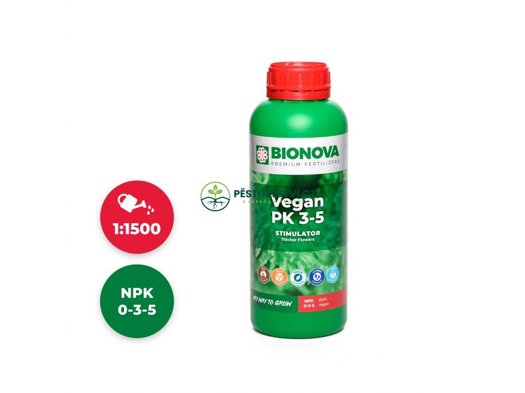Vyvážený poměr fosforu a draslíku podpoří rychlý rozkvět a masivní květenství. BioNova Vegan PK 3-5 se používá v celé fázi květu jako hlavní květový stimulátor v kombinaci s organickou výživou. Obsahuje pouze rostlinné látky.Doplňkové parametry