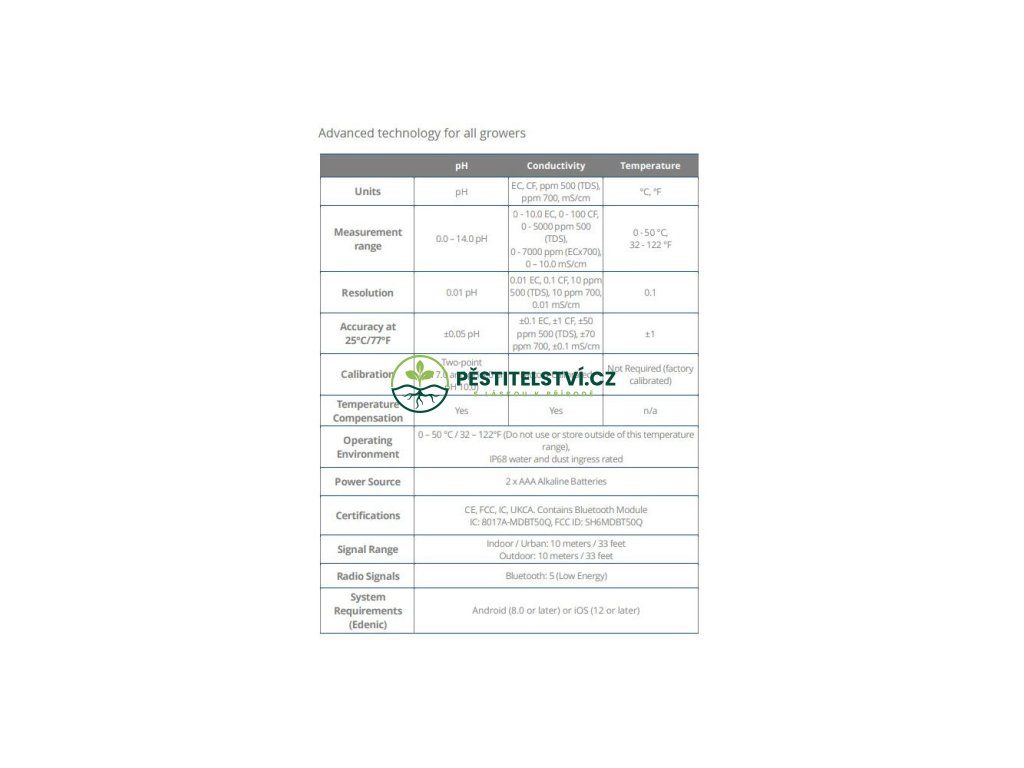 Přístroj 3 v 1 měří pH, vodivost (EC/PPM) a teplotu a optimalizuje příjem živin. Připojte se k aplikaci Edenic přes Bluetooth pro sdílení, aktualizace a komplexní správu dat v reálném čase.