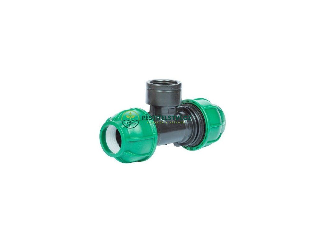 20x3/4"x20 mm - Mechanická tvarovka pro spojování potrubí z nízkohustotního polyethylenu PE-LD a středněhustotního polyethylenu PE-MD, vnitřní závit na odbočce, zelená