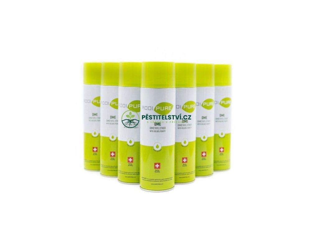 Dimethylether (DME), sprej 500 ml, 99,99% čistota, potvrzeno švýcarskou laboratoří, vhodný pro použití v potravinách, vysoké a plné množství extraktu, široké spektrum roztoků, ekologicky šetrná výroba v EU. Možnost smísení s n-butanem.