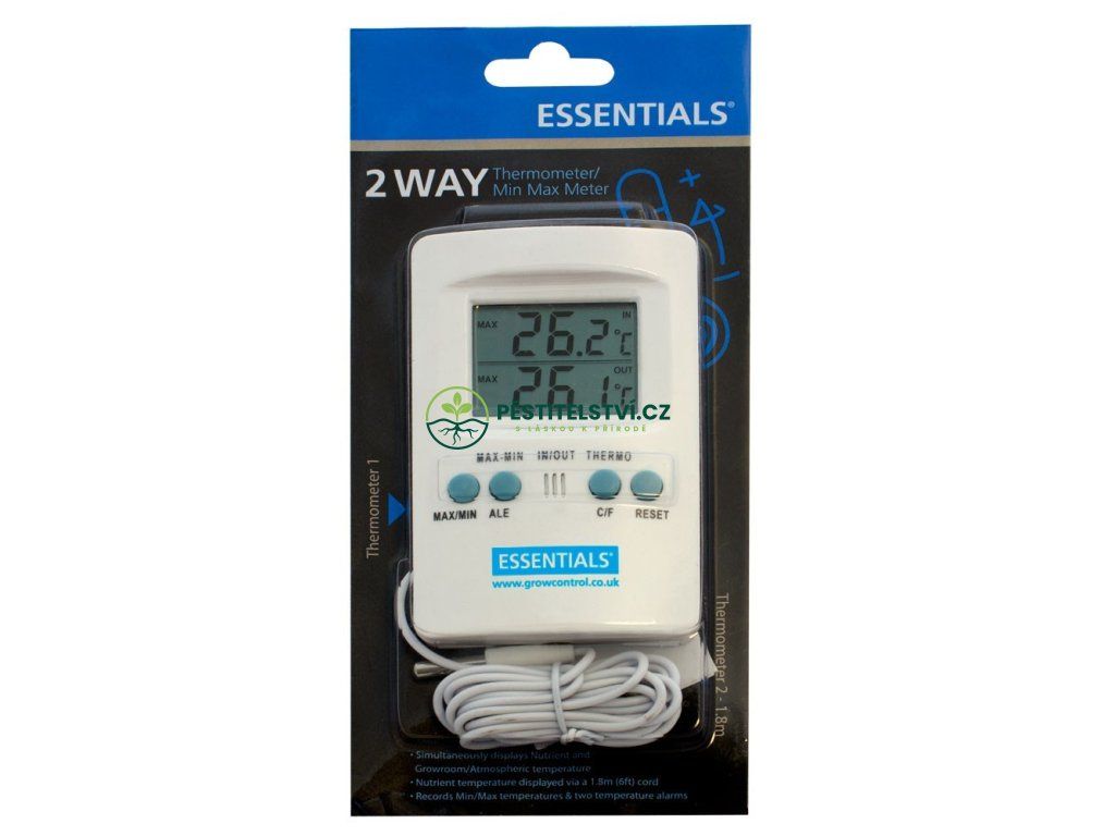 Essentials teploměr pro vnitřní i venkovní použití pro měření teploty v pěstební místnosti a zároveň měření teploty živného roztoku.