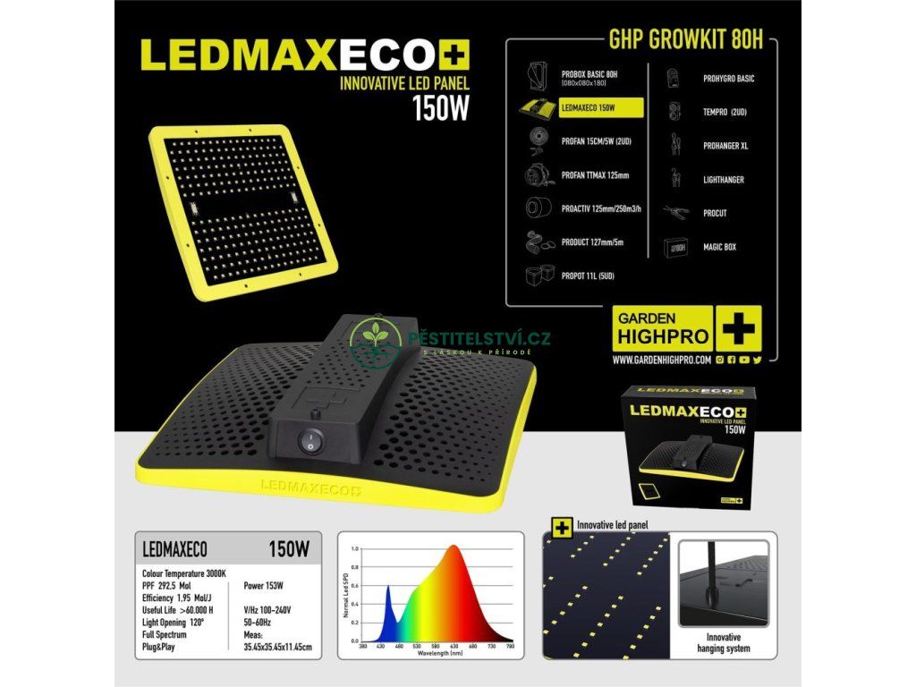 - LEDMAXECO 150 W LED osvětlení: Poskytuje účinné světlo s nízkou spotřebou, napodobující sluneční spektrum pro optimální fotosyntézu bez nadměrného tepla tradičních žárovek.
