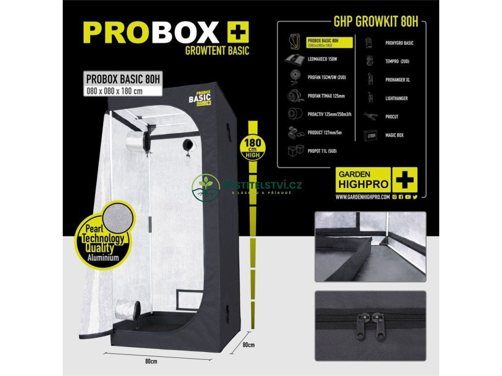- PROBOX BASIC pěstební stan: Kompaktní a robustní stan o rozměrech 80x80x180 cm je ideální pro maximální využití prostoru a optimalizaci růstu vašich rostlin v kontrolovaném prostředí.