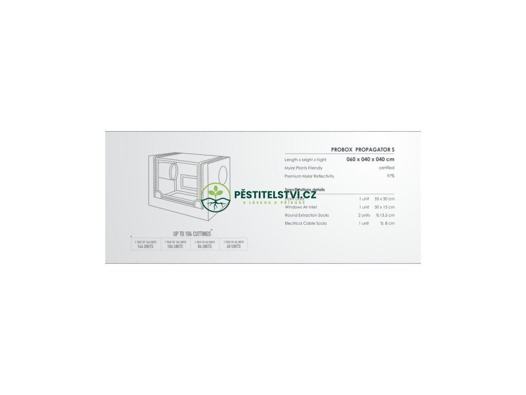 Speciální pěstební stan Probox Propagator S od Garden High Pro. Plášť z odolného vlákna Nylon 420D, vnitřní povrch Mylar s odrazivostí 97%. Vhodné pro nejmenší rostliny, sazenice, řízky. Rozměry 60 x 40 x 40 cm.