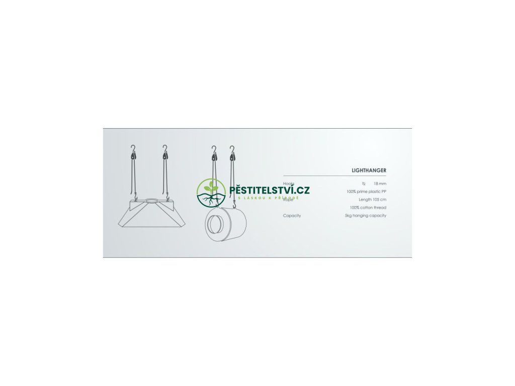 Lighthanger je důležitým doplňkem při instalaci a následném využívání umělého osvětlení. Šikovné a snadné uchycení pěstebních komponentů zajišťují háčky z odolného plastu. Závěs umožňuje nastavení libovolné vzdálenosti světla od květů a plodů až do výšky 105 cm. Jednoduše geniální systém kladky se západkou na pevném provaze, Rope Ratchet Lighthanger , je vyhledávaným pomocníkem praktických indoor pěstitelů.Doplňkové parametry