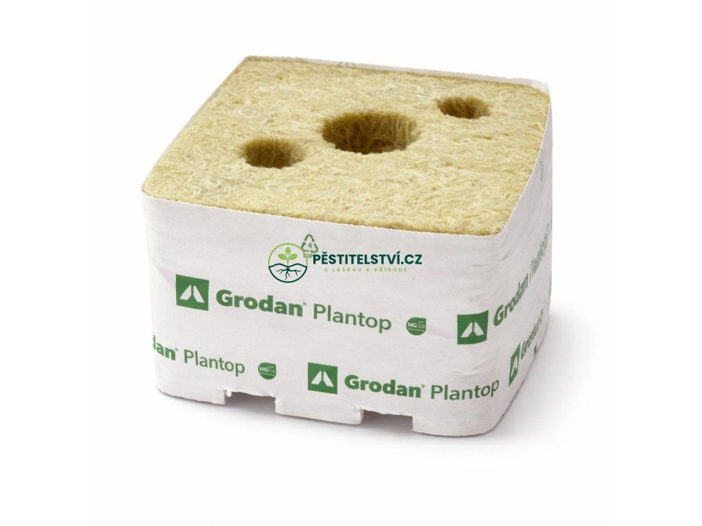 Grodan Plantop 100x100x65 mm, pěstební kostka 3 díry. Prostřední díra (27x40 mm) na rostlinu. Dvě postranní na kapiláry.