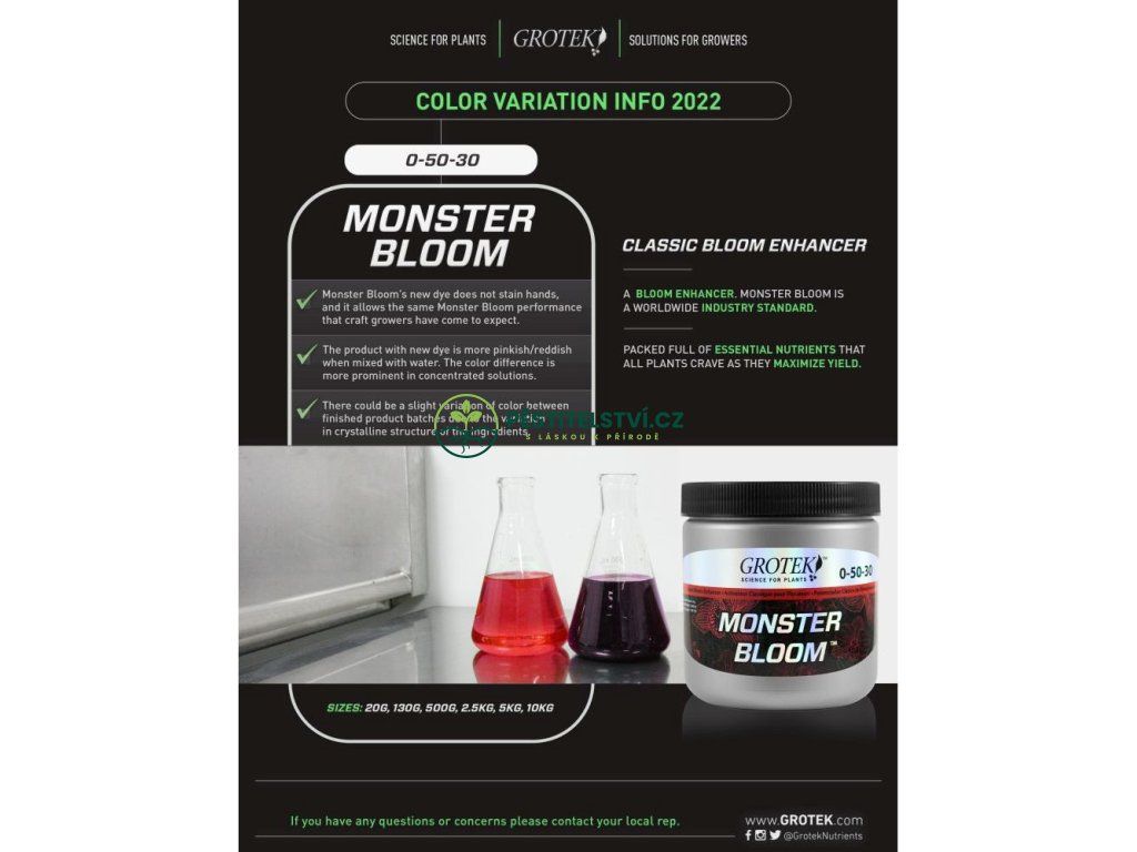 Monster Bloom je jediný produkt z nabídky Grotek, který ponecháme v nabídce. Další produkty Grotek ve výprodeji s vysokou slevou najdete zde. Po vyprodání už nebudou zaskladněny.