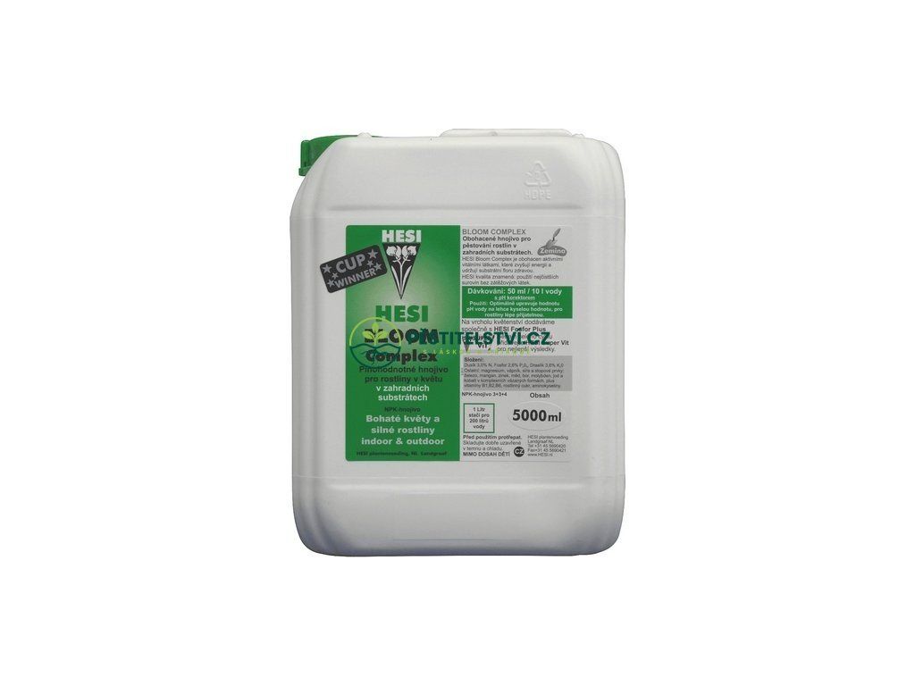 Obohacené hnojivo Hesi Bloom Complex je určen pro pěstování rostlin v zahradních substrátech v období květu. Bloom Complex je obohacen aktivními vitálními látkami (vitaminy a aminokyseliny), které zvyšují energii a udržují substrátní flóru zdravou. Během celého cyklu doporučujeme přidávat Hesi Super Vit pro nejlepší výsledek. Obsahuje minerální a organický dusík,takže nehrozí předávkování rostliny. Dávkování 5ml/1L vody.