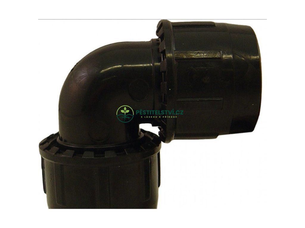 Plastový díl pro tlakovou závlahu, L spoj pro hadice o průměru 25 mm (1″). "Easy" komponenty se snadno instalují a díky plastové matce jsou chráněny před vyškubnutím.