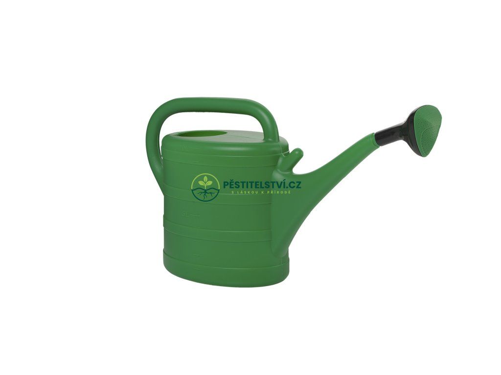 Zelená konev na zalévání rostlin a zahrady s objemem cca 10 litrů.