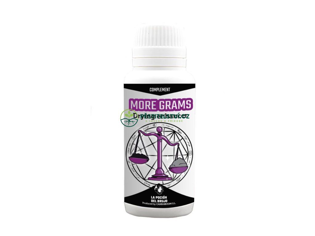 MORE GRAMS je světově unikátní přípravek: díky němu vaše plodiny v procesu sušení ztrácejí méně na hmotnosti. Funguje tak, že zvyšuje retenci vody v květu, opětovně hydratuje prostor mezi vlákny a umožňuje asimilaci této vody bohaté na živiny v závěrečné fázi kvetení. Organická hmota se zvýší těsně před řezem, což umožní, aby květ během fáze sušení ztratil o 10 % / 20 % méně hmotnosti.Způsob použití: