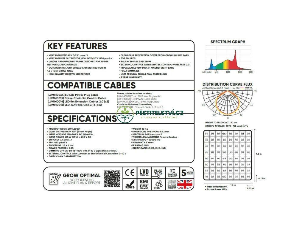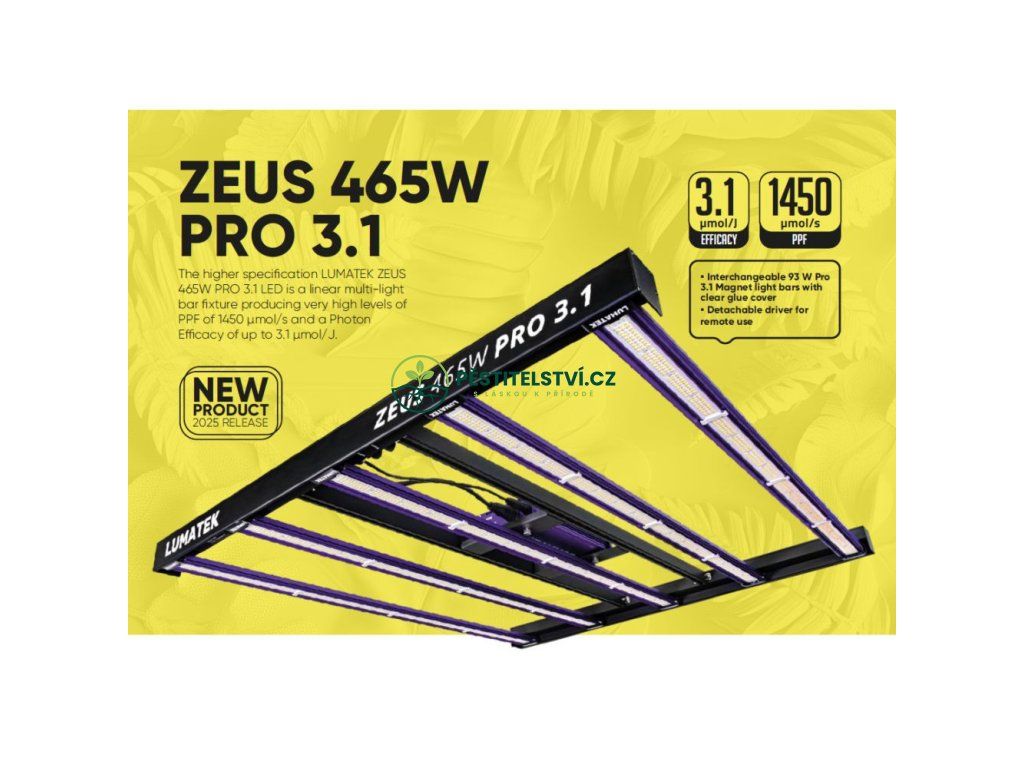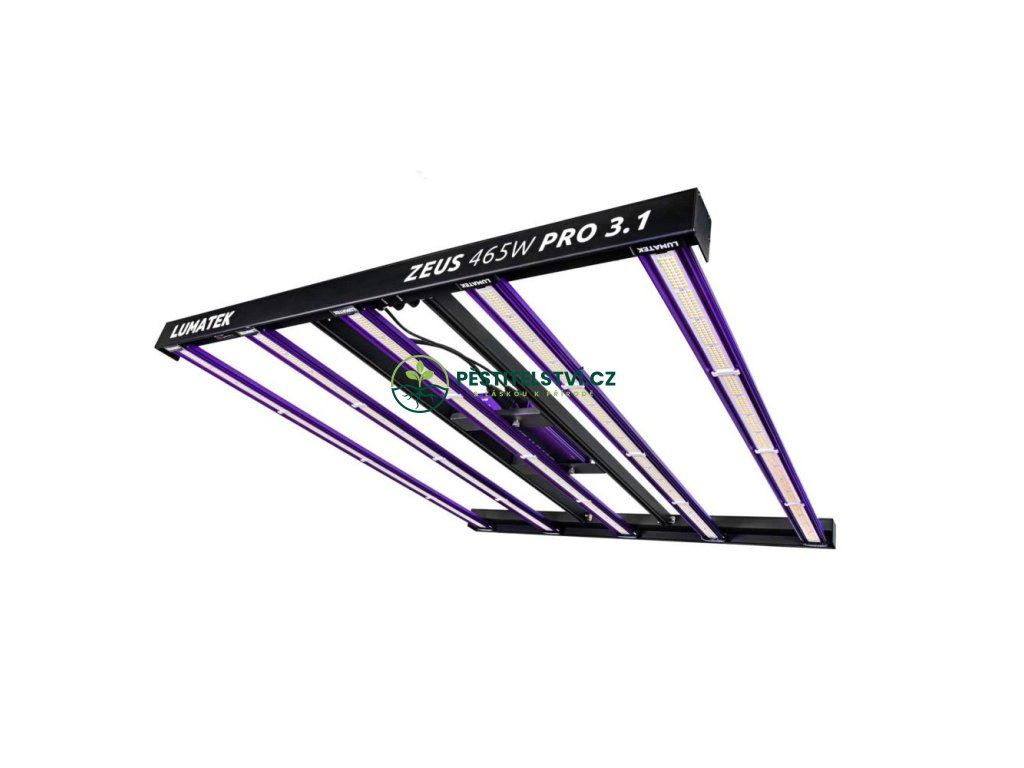 Vyšší specifikace LUMATEK ZEUS 465W PRO 3.1 LED je lineární vícesvětelné barové svítidlo, které produkuje velmi vysokou úroveň PPF 1450 mol/s a fotonovou účinnost až 3,1 mol/J.
