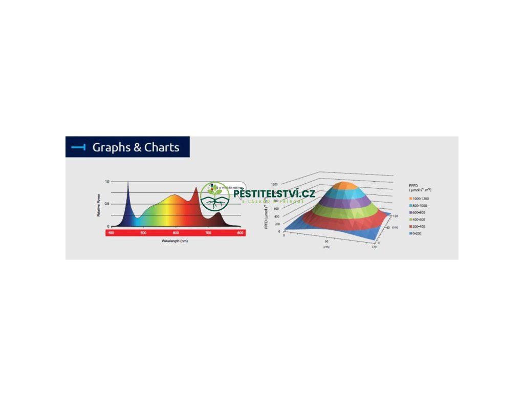 - Účinnost svítidla při použití příkonu LED (190W): 2,6 μmol/J