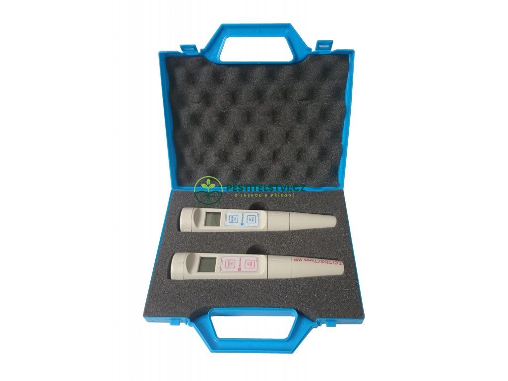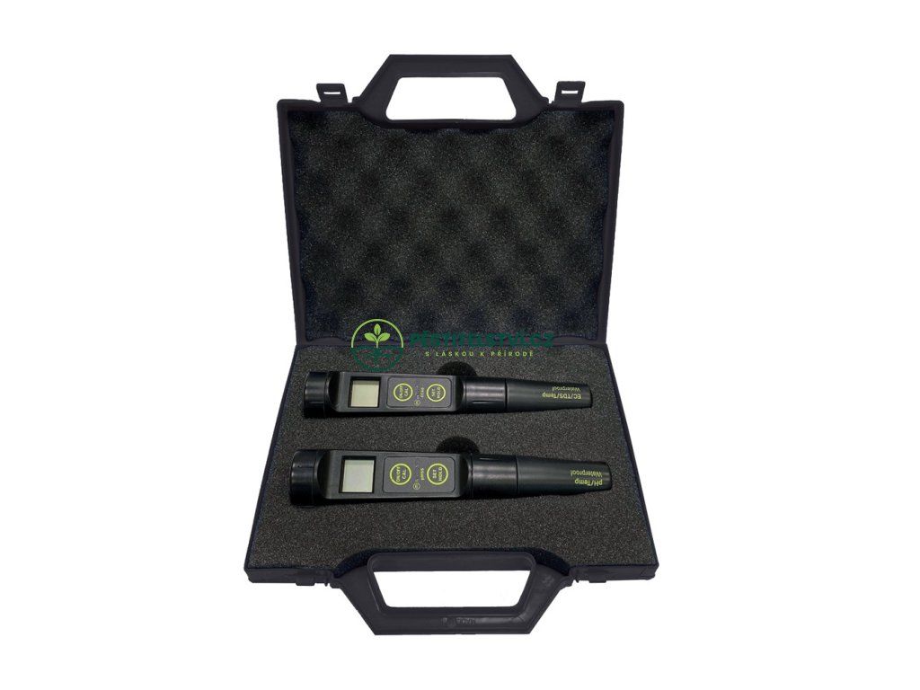 Tato sada obsahuje vodotěsný digitální EC a Ph metr s automatickým vyrovnáváním teploty. Přístroje jsou vodotěsné a mají vyměnitelné sondy.Balení obsahuje kalibrační roztoky.Kufřík je součástí balení.Doplňkové parametry