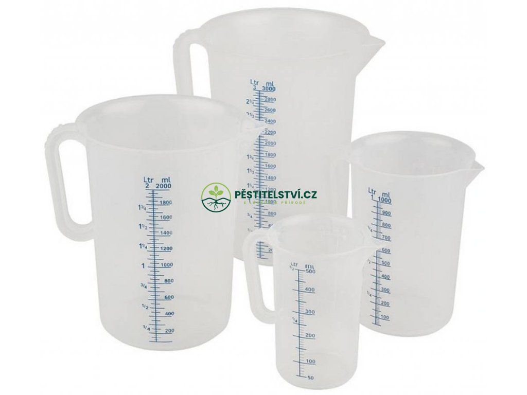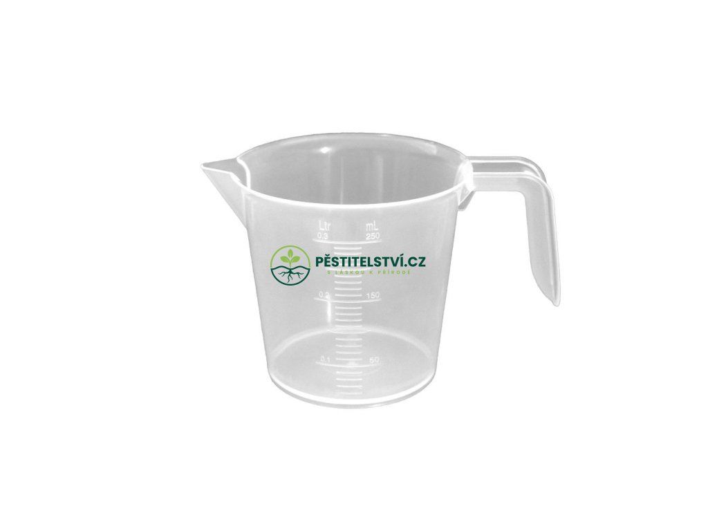 Odměrný džbánek - plastová odměrka s nálevkou, přesnost stupnice 10ml, objem 250ml, výška 97mm, průměr 80mm. Měření po 10 ml.