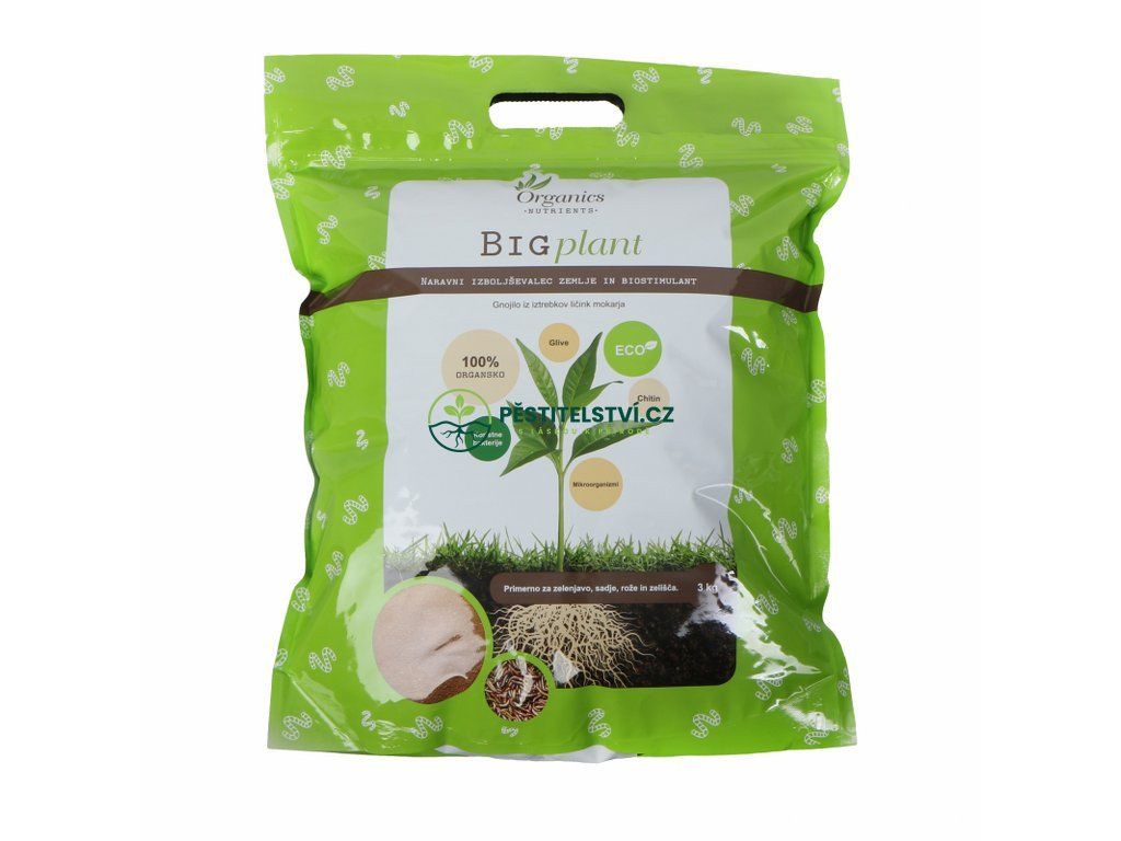 Big Plant je 100% přírodní prostředek pro zlepšení půdy pro Vaše rostliny a nabízí širokou škálu řadu biologických výhod. Podporuje silný růst rostlin, zlepšuje podmínky v kořenové oblasti a vytváří silné rostliny s velkým výnosem plodů. Obsahuje prospěšné mikroorganismy, bakterie a plísně, které silně zlepšují kořenový systém. Vzhledem k přítomnosti Chitinu v hnojivu Big Plant je přírodní navýšení odolnosti vůči škůdcům a chorobám, což je následně vidět na zvýšené úrodě, růstu a lepší chuti produktu. Obsahují také přírodní zdroj křemíku, hořčíku, manganu, boru, mědi a zinku.Doplňkové parametry