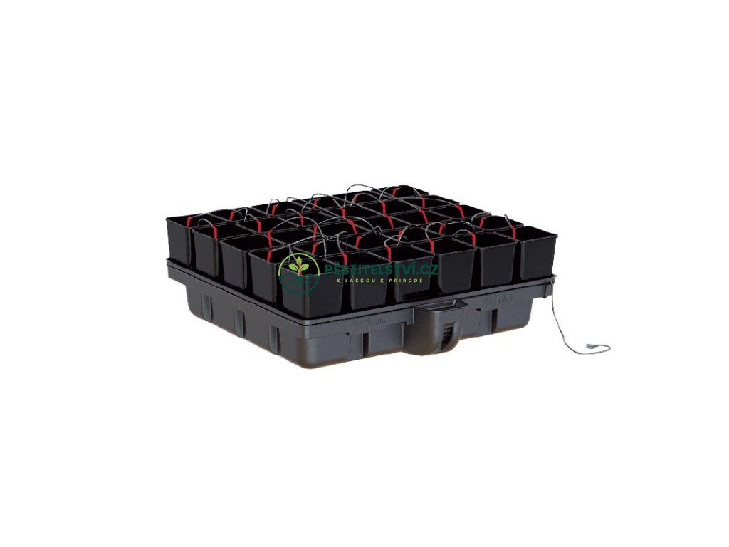 Hydroponický systém populární pro svou výhodnou cenu a spolehlivost. Velikost: 120x120x39 cm. Zásobník pojme max. 110 l roztoku. Pumpa má maximální průtok 1000 L/hod. Tento kit obsahuje také 30 x 6l květináče (18x18x23 cm).