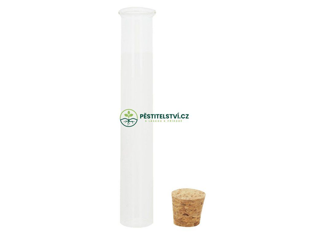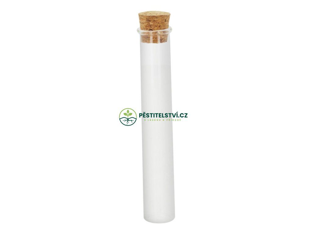 Skleněná zkumavka Qnubu California z borosilikátového skla s korkovým špuntem. Výška se špuntem 13 cm. Průměr 2 cm, hmotnost 0.01 kg.