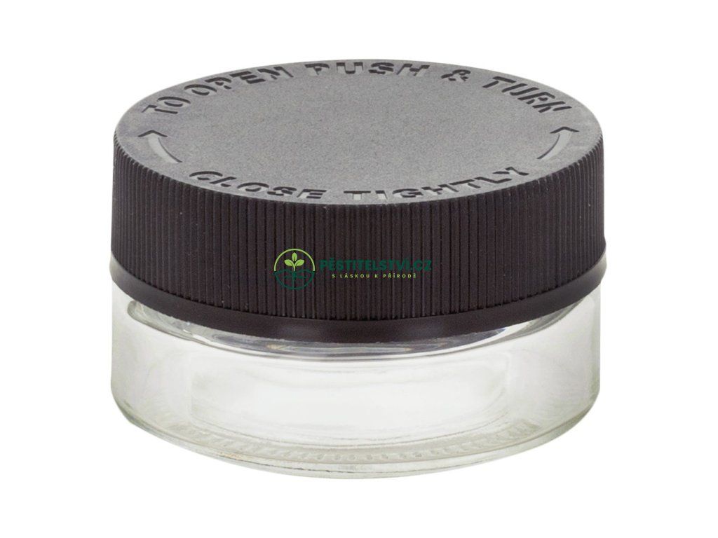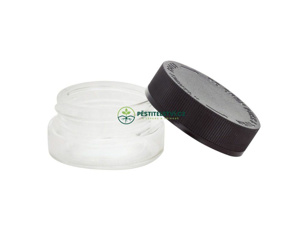 Průhledná sklenice se šroubovacím černým víkem Qnubu California Safe Pack. Borosilikátové sklo. Objem 30 ml. Průměr 4 cm, výška 6 cm, hmotnost 0.06 kg.