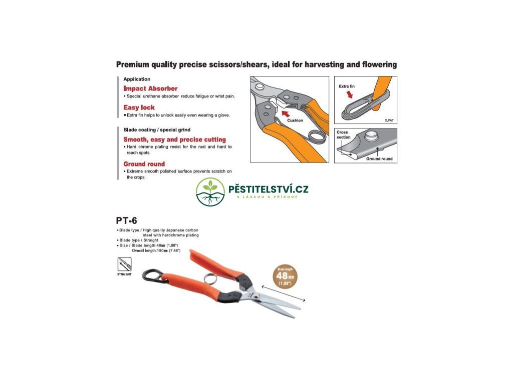 Rovné nůžky Saboten Harvest Shears 48 mm blades mají čepele z kvalitní japonské karbonové oceli potažené chromovanou vrstvou. Čepele jsou dlouhé 48 mm, celé nůžky 19 cm.