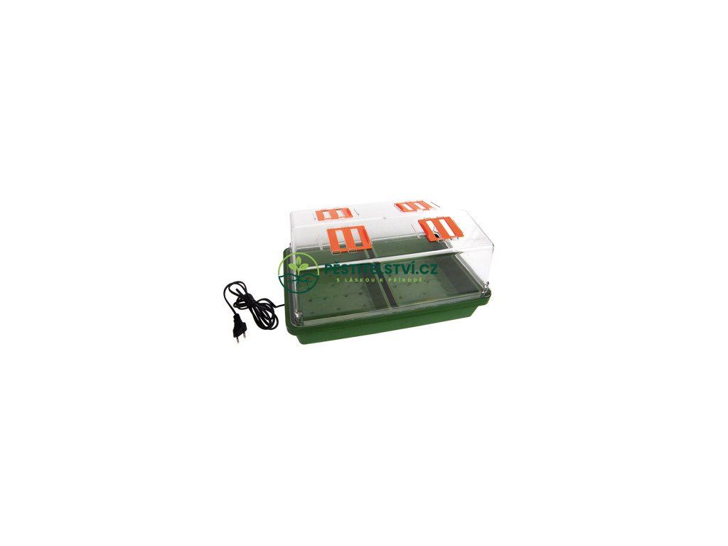 Malý plastový skleníček o rozměrech 38x24x19 cm a s vyhříváním je určen pro klíčení semínek nebo péči o sazenice a řízky. Dno je vyrobeno ze zeleného odolného plastu. Pevné víko je vybaveno 4 ventilačními klapkami. Bez termostatu.