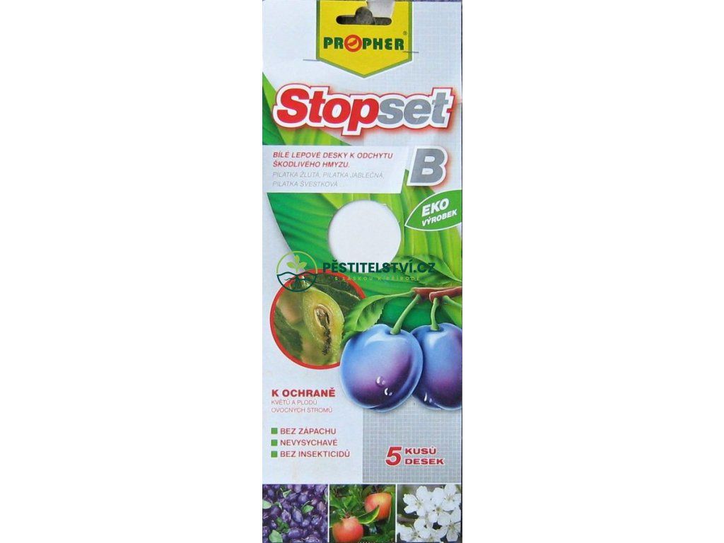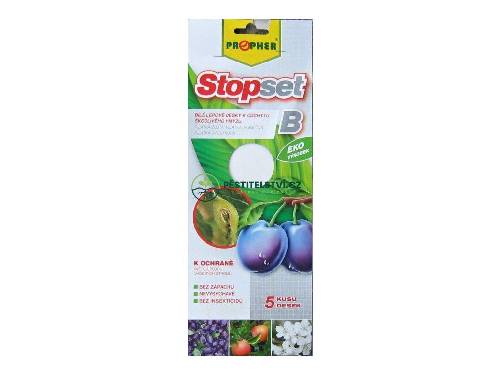 Bílé lepové desky Stopset o rozměrech 25x10 cm jsou dodávány v balení po 5 kusech. Lepové desky s nevysychajícím lepem v bílé barvě slouží k monitoringu a eliminaci pilatek na ovocných stromech, květilce nebo plodomorce zelné na zelenině. 3 desky lepí oboustranně, 2 desky pouze z jedné strany. Zavěšují se přímo na stromy nebo do těsné blízkosti.