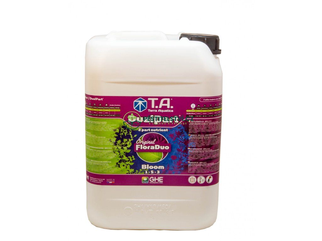 FloraDuo je všeobsahující živina přímo vytvořená pro rychle rostoucí rostliny s významným rozdílem mezi potřebami pro růst a kvetení. Je dodávána ve 2 složkách: FloraDuo Grow (růst) a FloraDuo Bloom (kvetení). Abychom získali ty nejlepší výsledky a přizpůsobili živinu pro všechny oblasti, nabízíme „Grow“ ve 2 verzích: jednu pro tvrdou vodu a jednu pro měkkou vodu. FloraDuo Grow “soft water – měkká voda” je určena pro demineralizovanou vodu a vodu s reverzní osmózou.
