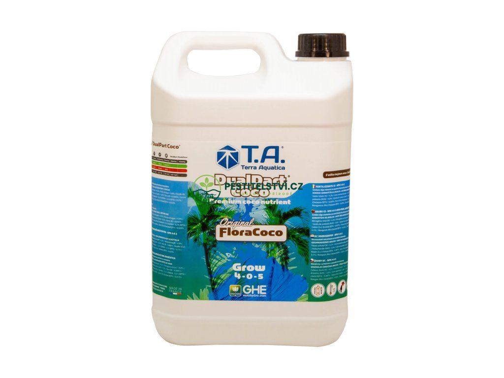 Terra Aquatica Coco DualPart Grow & Bloom je určeno pro pěstování v kokosovém substrátu. Komplexní základní výživa dodá rostlinám akurátní množství dusíku, fosforu a draslíku. Současně je hnojivo výjimečné bohaté na hořčík, vápník a stopové mikroprvky. Všechny substance jsou dobře rozpustné a vstřebatelné rostlinou. Kromě komplexní podpory růstu vylepšuje také vůni a chuť květů a plodů. DualPart Coco Grow a Bloom se používá současně, po celý pěstební cyklus. Nejdříve s vodou smícháme složku Grow, pak se přidá složka Bloom.Doplňkové parametry