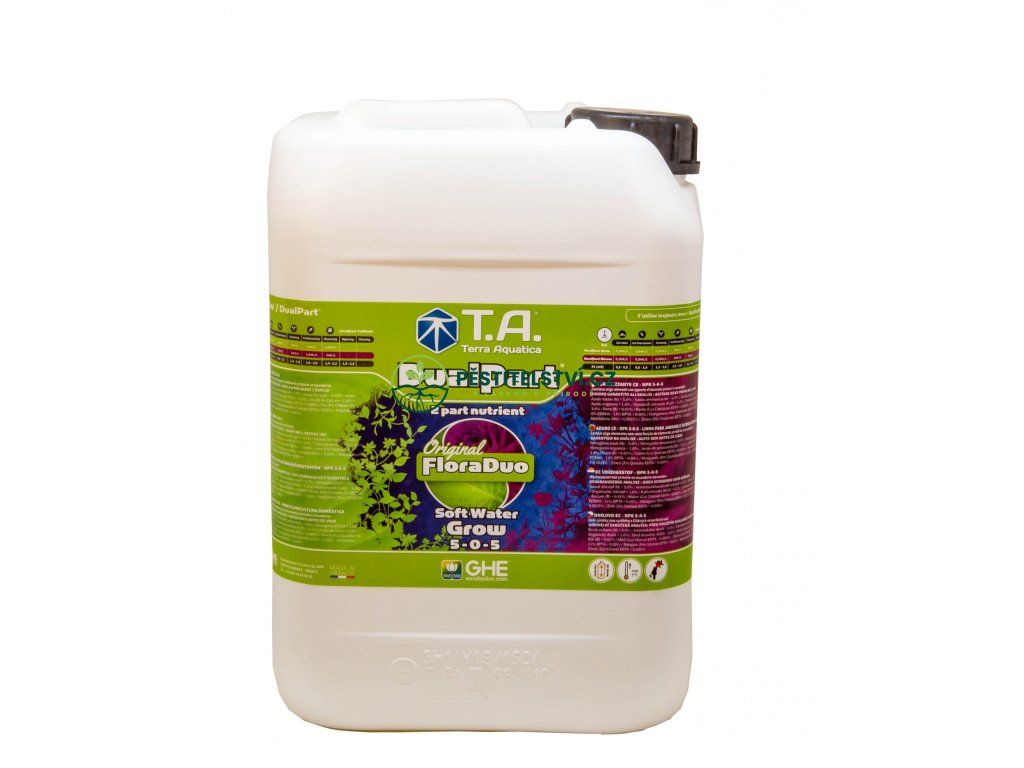 FloraDuo je všeobsahující živina přímo vytvořená pro rychle rostoucí rostliny s významným rozdílem mezi potřebami pro růst a kvetení. Je dodávána ve 2 složkách: FloraDuo Grow (růst) a FloraDuo Bloom (kvetení). Abychom získali ty nejlepší výsledky a přizpůsobili živinu pro všechny oblasti, nabízíme „Grow“ ve 2 verzích: jednu pro tvrdou vodu a jednu pro měkkou vodu. FloraDuo Grow “soft water – měkká voda” je určena pro demineralizovanou vodu a vodu s reverzní osmózou.