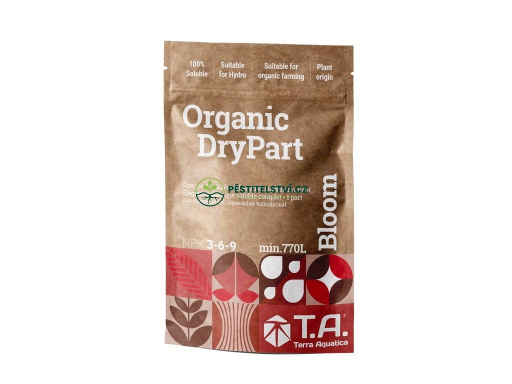 Terra Aquatica Organic DryPart (Grow pro fázi růstu, Bloom pro fázi květu) podporuje vaše rostliny v každé fázi jejich vývoje: Bohatší vegetace: stimuluje bujný a zdravý růst. Husté, chutné květy a plody: zvyšuje obsah cukru. Vylepšená vůně: posiluje přirozené aroma. Maximalizované výnosy: zlepšuje kvalitu a objem sklizně. Kompletní výživa: okamžitý účinek na rostlinu a dlouhodobý účinek na půdu. 100% bio hnojivo je kompatibilní se všemi způsoby pěstování (půda, kokos, hydroponie) a zavlažovacími systémy - ručními nebo kapkovými. Organic DryPart® byl důkladně testován na různých plodinách, aby byla zaručena optimální účinnost. Ve formě prášku je přeprava zjednodušena a dokonale splňuje očekávání pěstitelů, ať už amatérských nebo profesionálních, ve sklenících nebo na volných plochách. Terra Aquatica Organic DryPart® je vysoce koncentrovaný: Při každé zálivce je třeba aplikovat maximálně 1,3 g/l, současně je třeba zohlednit pH, teplotu a kvalitu substrátu. Před aplikací dobře rozpusťte ve vodě. Po otevření skladujte Organic DryPart® na suchém místě v původním obalu.Doplňkové parametry