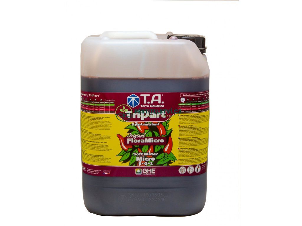 - FloraMicro: Poskytuje vaší rostlině veškeré potřebné mikroprvky v chelátové formě. To zahrnuje také submikroprvky a organické pufry, což v roztoku pomáhá stabilizovat pH. FloraMicro doplňuje FloraGro a FloraBloom v sekundárních a hlavních živinách. Aby se přípravek co nejlépe přizpůsobil vaší vodě, existuje složení pro tvrdou i měkkou vodu.