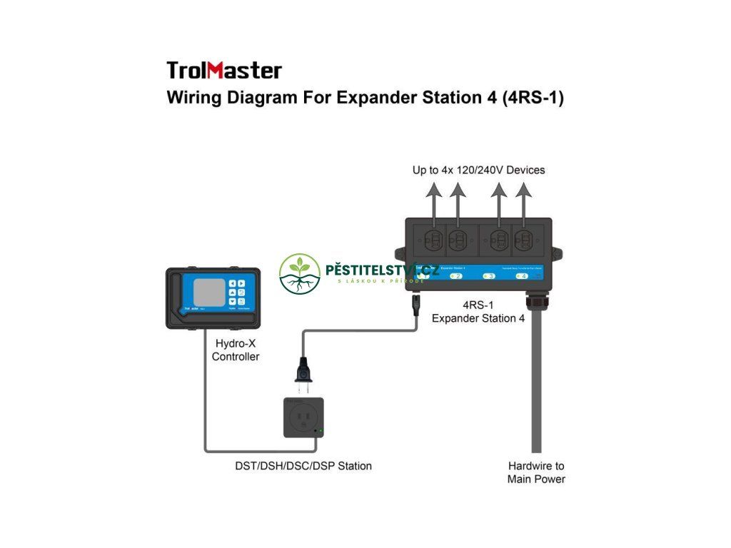 4RS-1 je univerzální rozšiřující modul se 4 zásuvkami. Lze jej použít s jakýmkoli modulem zařízení TrolMaster ve stylu "plug-in" a rozšířit tak počet zařízení, která lze ovládat pomocí systému Hydro-X. Jediný "spouštěcí" kabel 120-240 V na modulu 4RS-1 se připojuje k vašemu zařízení / řídicímu modulu. Když je modul zařízení aktivován zařízením Hydro-x, spouštěcí kabel 4RS-1 zapne každou ze 4 zásuvek na 4RS-1 s časovou prodlevou 3 sekundy mezi aktivací každé zásuvky. Tím se minimalizuje vysoký náběh (rozběhový proud) a umožňuje bezpečné ovládání až 4 zařízení. 4RS-1 musí být instalován s napájecím obvodem 120/240 V (až 50 A při 240 V). Tři drátové svorky uvnitř jednotky umožňují připojení vodičů do velikosti 6 AWG, což usnadňuje připojení ke zdroji napájení.