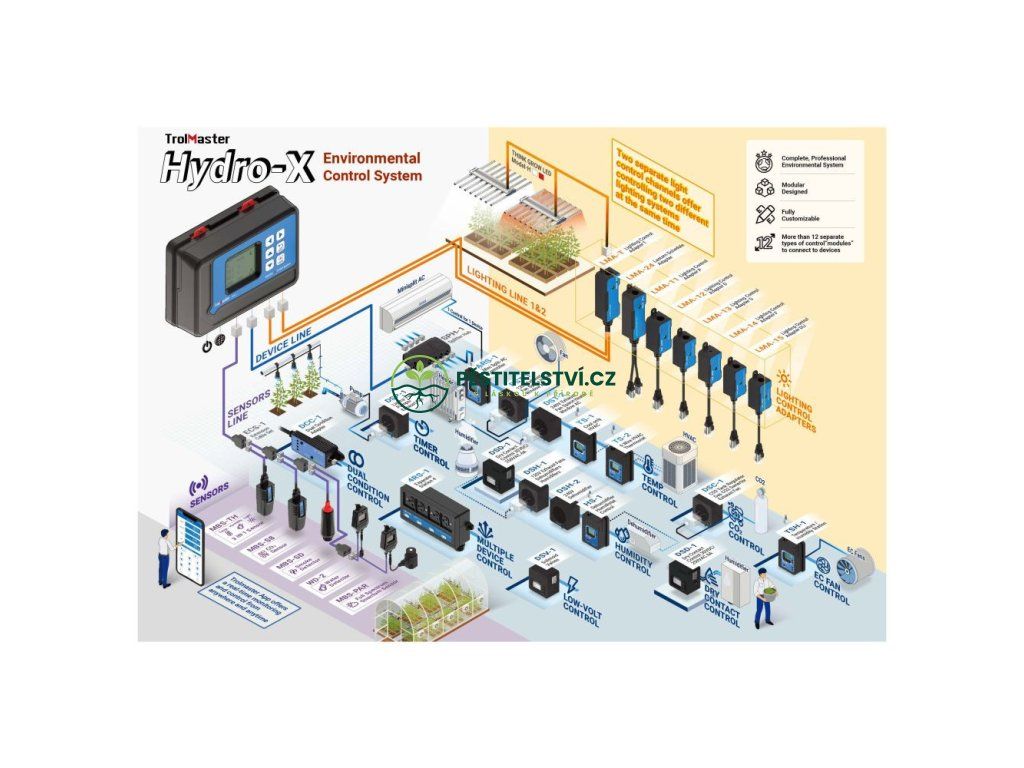 Systém Hydro-X je profesionální jednozónový systém pro řízení prostředí. Je plně přizpůsobitelný a modulárně navržený. Instalace je jednoduchá a systém lze snadno rozšiřovat. Systém Hydro-X může ovládat většinu značek pěstebních světel, systémů HVAC, mini-split klimatizací, komerčních odvlhčovačů a zvlhčovačů vzduchu, stejně jako generátorů nebo regulátorů CO2. Pomocí bezplatné aplikace TrolMaster má uživatel přístup ke všem nastavením a výstrahám systému odkudkoli a kdykoli.