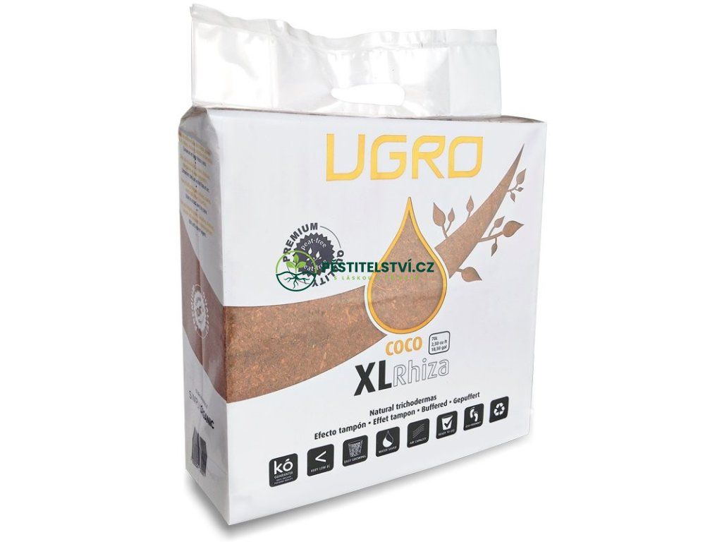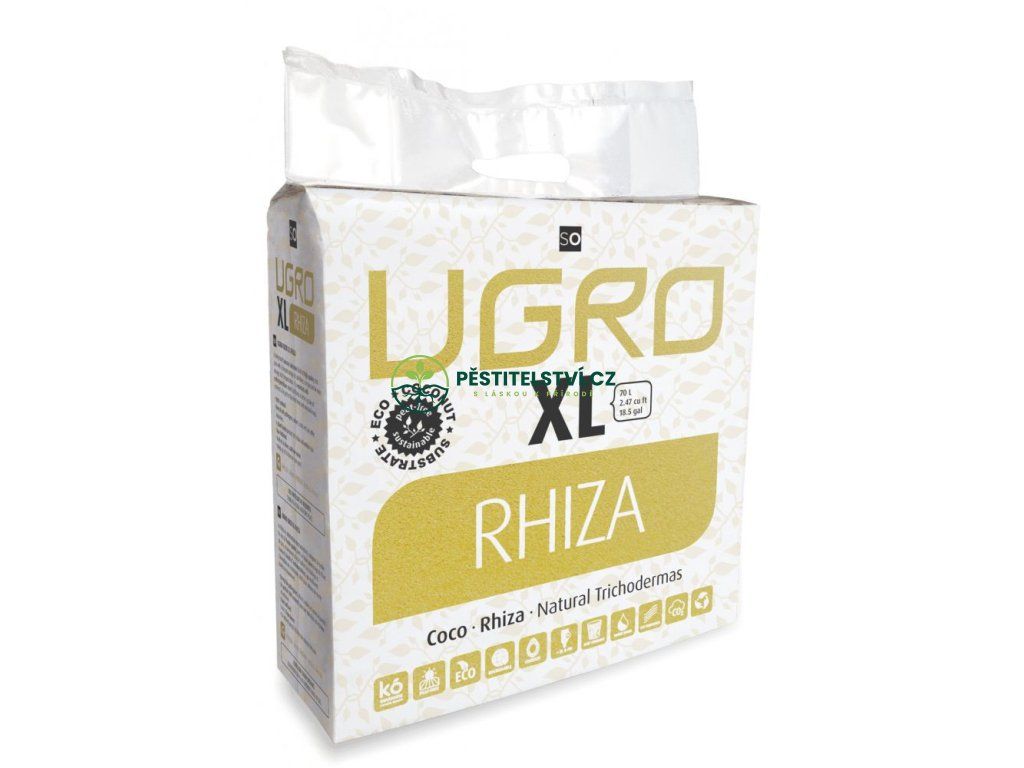 U Gro RHIZA XL je 5 kg vážící cihla z lisovaného a dehydratovaného kokosu z malých částic s nízkým procentem vláken, smíšené s endomycorrhizae (5%).Toto je speciální ektomykorhizní houba, která vytváří kolem kořene tzv. hyfový plášť, díky němuž se zvyšuje savá plocha soustavy kořenového systému.